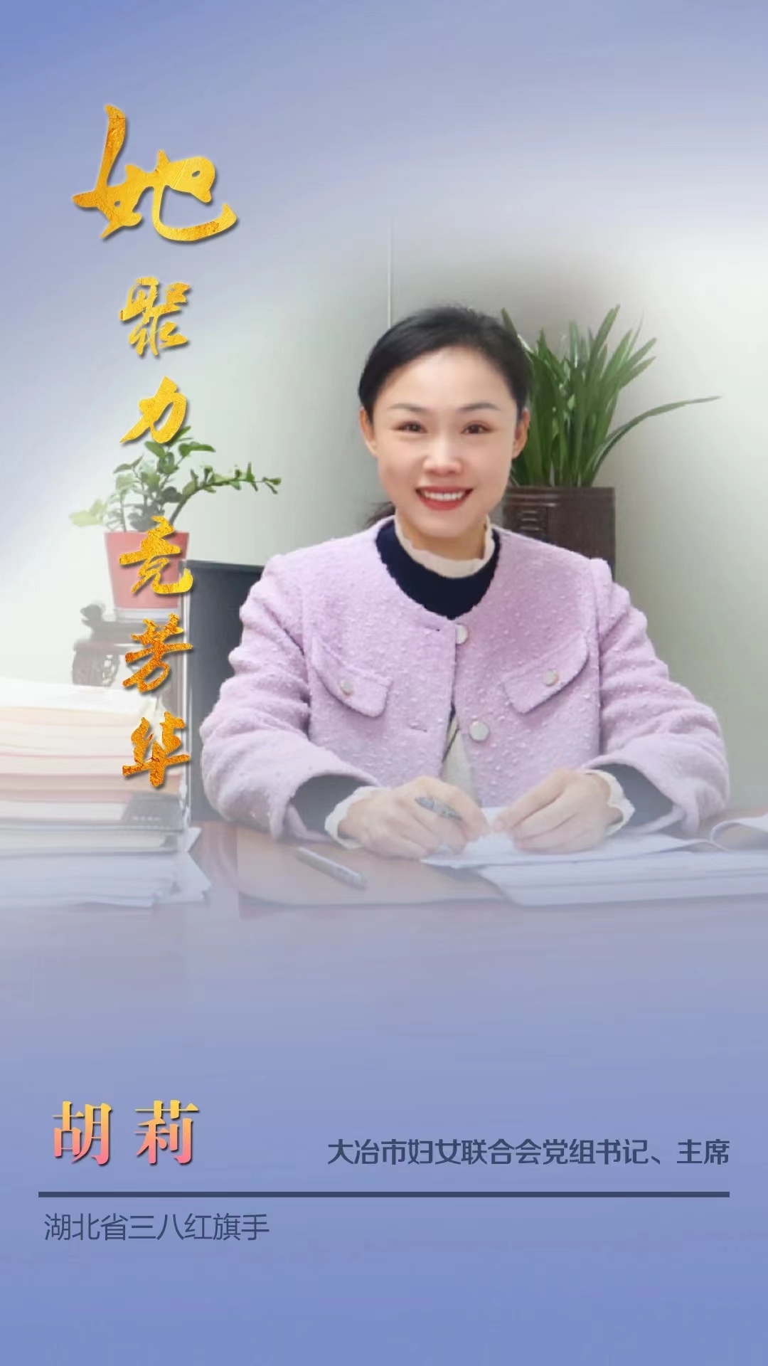 ? 胡莉,工作十九年,先后經歷組織、鄉鎮、黨辦、群團等不同崗位,她始終牢記肩負的責任和使命,以全心全意為人民服務為出發點,以加強理論和業務學習為立足點,以辦好事實事為著力點,積極投身于改革發展、鄉村振興、創新創業的浪潮,在經濟社會發展中奮力譜寫巾幗華章。