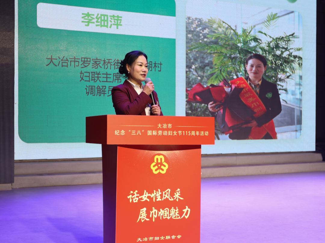 ???? ?3月6日,大冶市婦聯(lián)舉辦“話女性風采??展巾幗魅力”紀念“三八”國際勞動婦女節(jié)115周年活動,趙鎖梅、李細萍等8名各行各業(yè)優(yōu)秀婦女代表現(xiàn)場講述了她們的精彩故事,展現(xiàn)了女性的魅力和風采,贏得現(xiàn)場觀眾的陣陣掌聲。活動現(xiàn)場禮遇了農(nóng)村致富女帶頭人、優(yōu)秀婦女工作者、優(yōu)秀家事調(diào)解員、優(yōu)秀巾幗宣講員、優(yōu)秀愛心媽媽、最美家庭代表、美麗庭院女主人等各領(lǐng)域代表30名,還特別禮遇了2024年度全國三八紅旗集體獲獎單位大冶市政務服務和大數(shù)據(jù)管理局。活動最后,全場婦女姐妹集體倡議,號召全市廣大婦女和家庭堅定信念跟黨走,勤于學習,崇德向善,奮勇爭先,譜寫新篇。