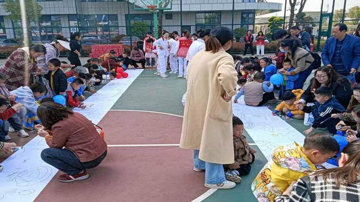 本次活動的重頭戲是“藍絲帶奇妙日——和星星做朋友”互動游戲環節。家長代表、志愿者與孤獨癥兒童共同參與了杯子搭房子、小馬過河、球球大作戰、合作套圈圈、百米長卷繪畫等游戲。在杯子搭房子游戲中,家長代表和志愿者根據圖片提示,指導小朋友拿取相應顏色的杯子,大家一起協作搭建房子;小馬過河游戲中,兩位小朋友一組,通過移動木磚的方式讓“小馬”移動到終點;球球大作戰則考驗小朋友與家長之間的默契,他們面對面夾住球,將球運送到終點;合作套圈圈游戲中,小朋友一只腳上套圈圈,家長抱著小朋友將圈圈套在雪糕筒上;百米長卷繪畫環節,大家共同完成畫作,并在畫上寫下對孤獨癥兒童的祝福。這些游戲不僅幫助孤獨癥兒童突破社交壁壘,也讓家長學會了愛與包容,為社會融合創造了良好的開端。